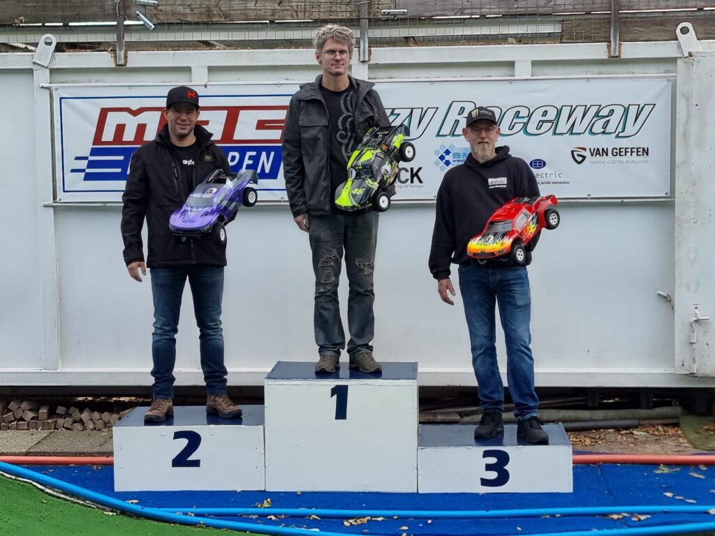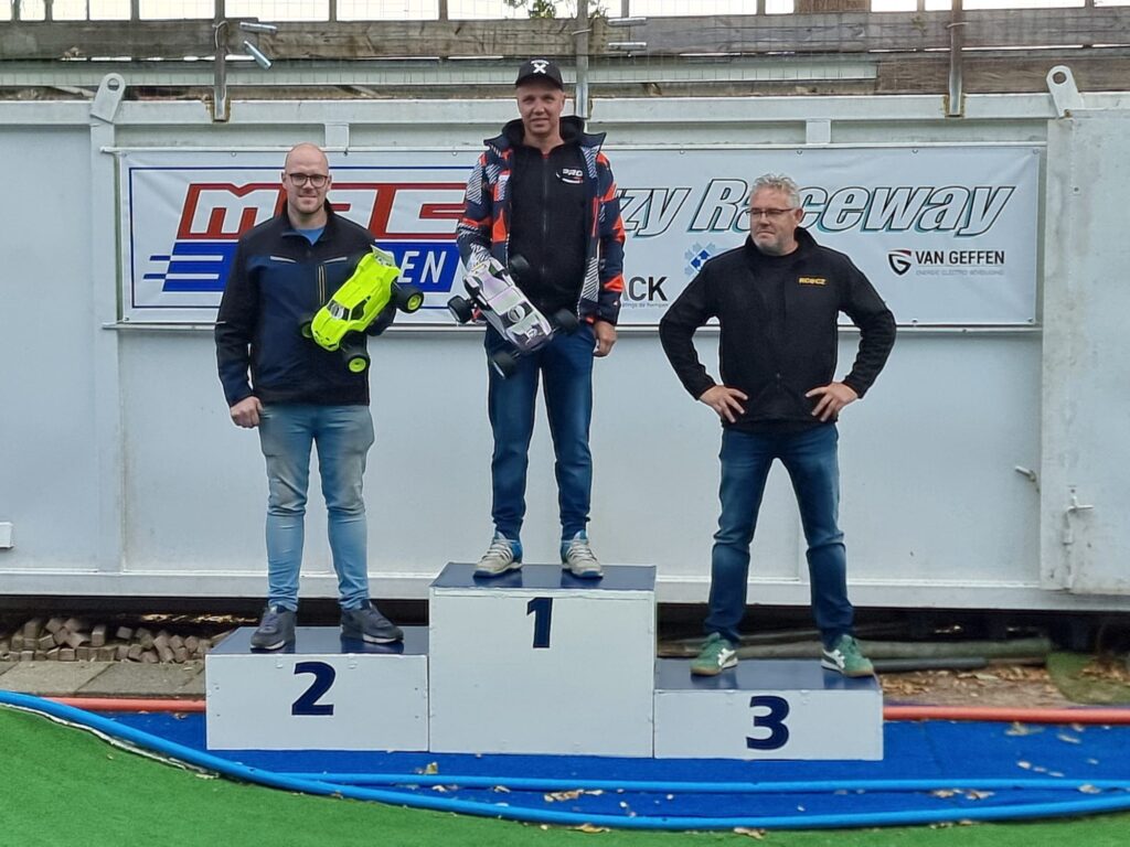 Met een fris herfstwindje begon de dag met trainen en kwalificaties onder droge omstandigheden. Onze vaste legendarische timekeeper Arjan had de kwalificatieheats strak achter elkaar afgewerkt zodat een aankomend buitje de kwalificaties iig niet in de war zou schoppen. Als Dizzy Raceway al niet genoeg vereist van het talent van de rijders, deed het weer er, zoals verwacht, na de eerste finale heats een klein schepje bovenop met een fiks buitje! Na een kleine pauze van een minuutje of 10 gingen de tweede finales dus onder natte omstandigheden van start. Iedereen dus massaal over op de silver compound en een low-grip setup (indien van toepassing). De baan droogde echter weer snel op, zodoende werden de derde finales juist weer onder droge omstandigheden verreden. De dag werd in stijl met een lekker zonnetje afgesloten.
